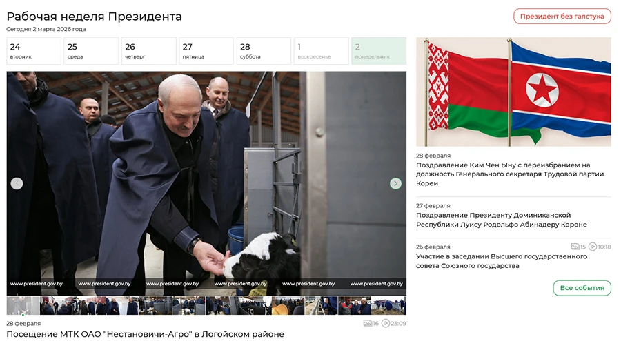 На официальном сайте Лукашенко на третий день войны по-прежнему телята и навоз.